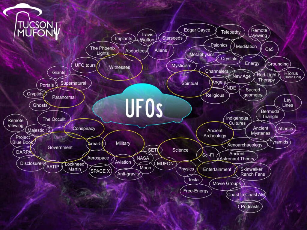 Recently at a Contact In The Desert event, Karen made some new friends and had asked if they were going to any of the upcoming UFO Conferences in Sedona, AZ. She thought it was weird when they all said “no”.. Karen has been to many UFO Conferences since 2016. She noticed that people are picky about which information they want to hear about and only go to specific UFO Conferences. Karen goes to all the UFO conferences she can find in a 400 miles radius. She began mapping out all the topics that unite people in the study of UFOs, a UFO MAP if you will.